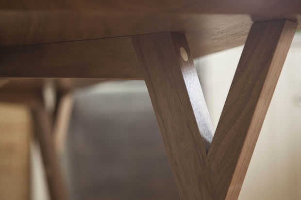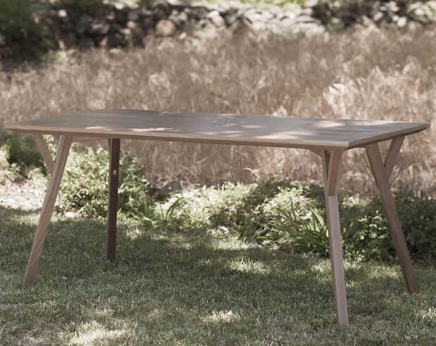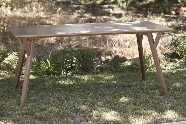 Acabamos la mesa con dos capas de acabado de poliuretano (de base acuosa) claro. Hemos oído los acabados de poliuretano de base aceitosa pueden amarillear la madera, y queríamos mantener el color natural de la madera tanto como fuera posible. Pero a cambio de mantener el color, el poliuretano de base acuosa tiende a hacer más áspera la superficie, levantando el grano de la madera, pesé un diligente de lijado de las Naciones Unidas.