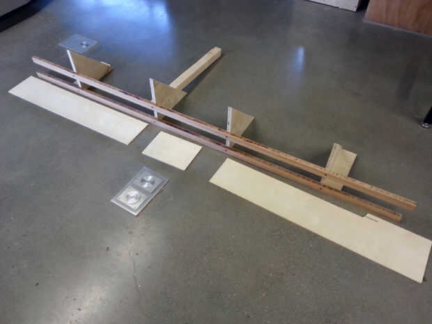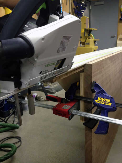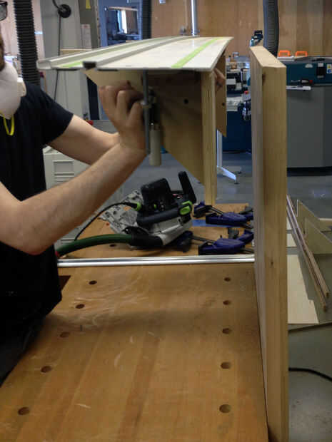 El diseño incluía un largo conjunto a lo largo de los bordes del tablero. No pudimos usar la sierra de mesa, ya el ángulo del bisel era más de 45 º, así construimos una pantalla grande y usamos mano una de sierra. La plantilla consiste en una serie de triángulos de 90 º atornillados a una tabla de plyboo (o medidas). Luego, la plantilla se fijó al tablero en sentido perpendicular, con la vía para la sierra puesta encima. Nos llevó un par de tentativas para acertarlo.