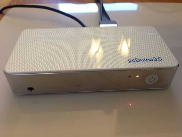 La versión especial de pcDuino3 tiene un jack de audio en el frente, junto con dos LEDs, rojo para la energía y verde para el estado del sistema. También hay un botón de encendido iluminado. Vuelta, podemos encontrar tres puerto de host USB, un puerto HDMI, un puerto Ethernet y una microUSB DC energía. El diseño es muy delgado.