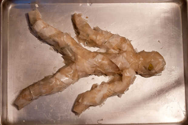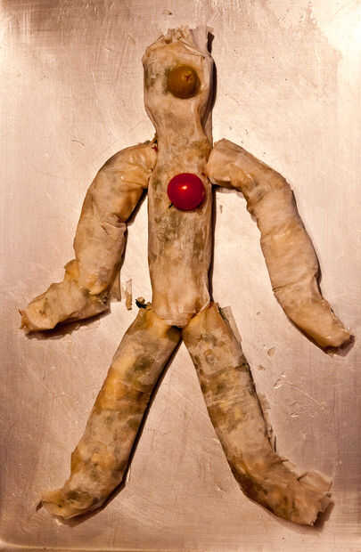 5. Envuelva y pegue en la momia romper la tira de masa según sea necesario. Trabajar con él tanto como usted papel mache, construcción de áreas que lo necesitan, ocultar el corazón del tomate y envolver alrededor de los ojos verde oliva. Cepille las áreas secas con más aceite. Hacer una segunda hoja de tiras y continuar hasta la cobertura completa de la momia.