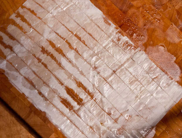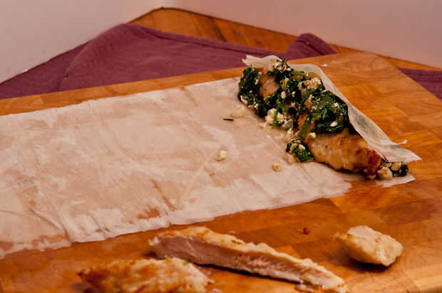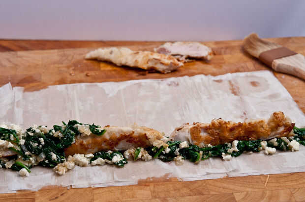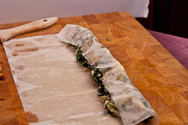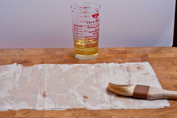 1. Coloque una hoja de pasta filo sobre un tablero de corte y un cepillo con aceite de oliva.