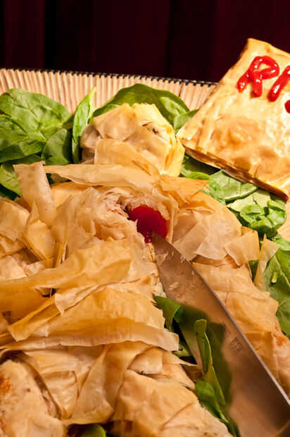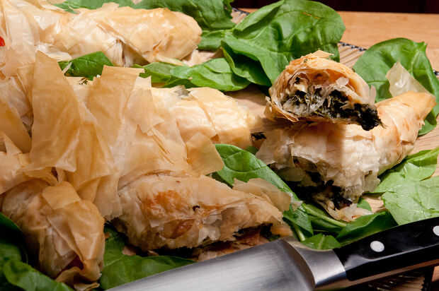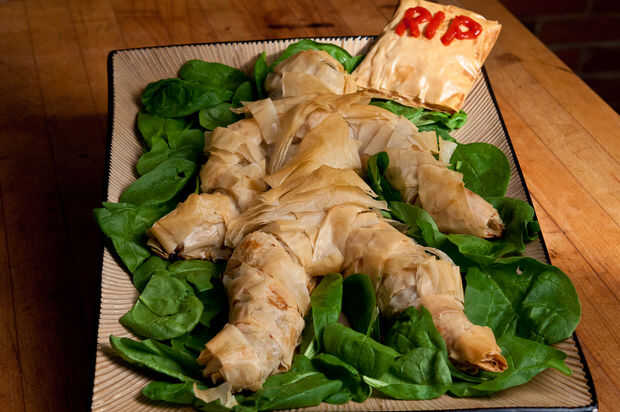 4. sirva la momia sobre un lecho de hojas de espinaca con la lápida cerca de su cabeza.