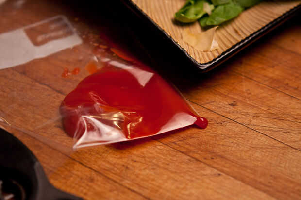 3. Coloque una cucharada de salsa de tomate en una bolsa zip-lock. Cortar el la punta y escribir RIP en la parte superior de la lápida.