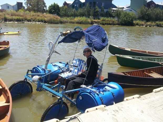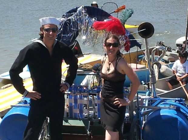 En el día del evento llegó una hora más temprano y poner los barriles en y redecorado hacia fuera en el estacionamiento. Entonces fuimos capaces de montarlo en. El sleue de Petaluma está sujeto a las mareas y la marea estaba baja, así que dejamos la moto por encima del muelle y esperando más agua. Una hora antes de la carrera que consiguió ayuda y llevado al bicicleta/del barco, que ahora se llama Blue Stell Disco, abajo cerca del agua. Lanzamiento fue una risa lo bastante inclinada en el agua y sumerge la mitad delantera antes de que podríamos obtener de la parte posterior la mitad del muelle.