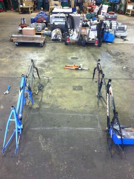 Después de una media docena de bicis elegí cuatro de ellos para las cuatro esquinas de la moto grande. En la parte trasera que me aseguré que las dimensiones del triángulo trasero estaban tan cercanas como sea posible. He intentado coincidir con la parte delantera, así. Las imágenes muestran cuatro motos que elegí el conjunto en un contorno de tiza de la moto terminada. Me di cuenta de cuánto espacio que necesitaba para el asiento y cuánto quería la bicicleta para ser. Yo estaba limitado por las dimensiones de una hoja de madera contrachapada que estaría utilizando para un estante de la azotea.