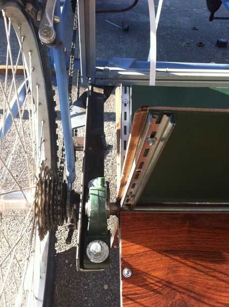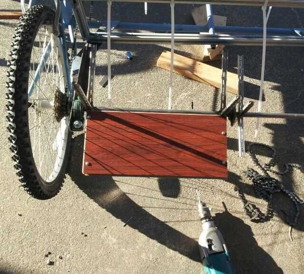 Para girar la rueda hemos añadido un anillo de la cadena al medio conjunto de manivelas. Para ello teníamos que cortar la promociona off pero tenemos un soldador para su bien. Al centro del eje de rueda de paleta añade una corona trasera de una bici de los cabritos y había soldada en su lugar. Janelle corta y soldar todos los bits del estante de la plata en donde las palas debían ser. Muy pronto tuvimos una rueda de hila. Después de ejecutar la cadena hasta el plato estábamos en el negocio.