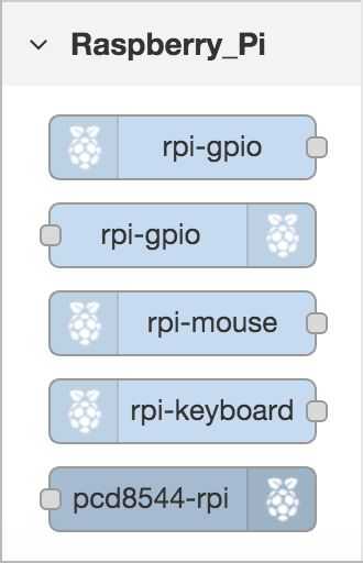 Deberá abrir el nodo rojo. En la parte inferior izquierda, aparecen los cuadros específicos de Raspberry Pi, y debería ver el cuadro PCD8544 LCD.