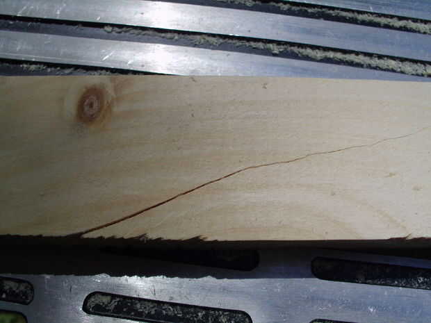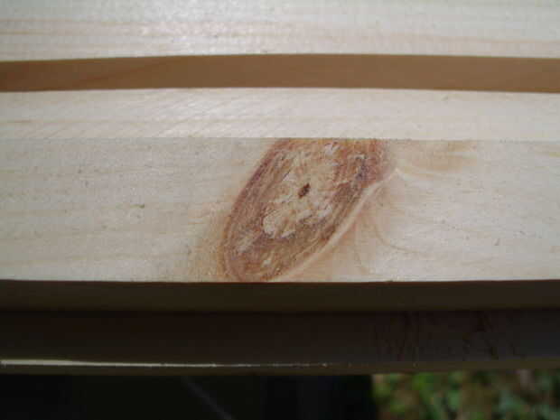La manera más eficiente de cortar estas piezas es cortar dos piezas laterales y dos piezas de asiento de cada longitud. Cuando usted esté cortando estas desea estar al tanto de un par de cosas. En primer lugar, no queremos cualquier posibles fallas estructurales debido a debilidades en la madera, así que ten cuidado para fracturas y grandes nudos. Cortar a cada lado de estos tipos de imperfecciones. Si recortas dos piezas largas y dos cortas piezas de cada longitud, se tienen cerca de 10" o tan de chatarra sobrante, así que si tienes que cortar un nudo o dividir por la mitad de su longitud, usted todavía tiene suficiente para conseguir las cuatro piezas. No olvides que también tienes algunas longitudes extras a utilizar demasiado, para no ser demasiado tacaños y piezas inadecuadas.