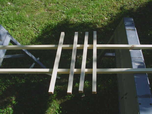 Dicho esto, estarás listo para empezar a cortar. Primero corte 17 piezas que son 27" de largo. Hago esto por corte de dos piezas de cada longitud hasta que he cortado a todos. Eso significa que habrá corte de 54" de cada 8' longitud dejando unos 42". Estas piezas largas son fáciles porque son sólo un bonito recto 27" con sin ángulos ni nada.