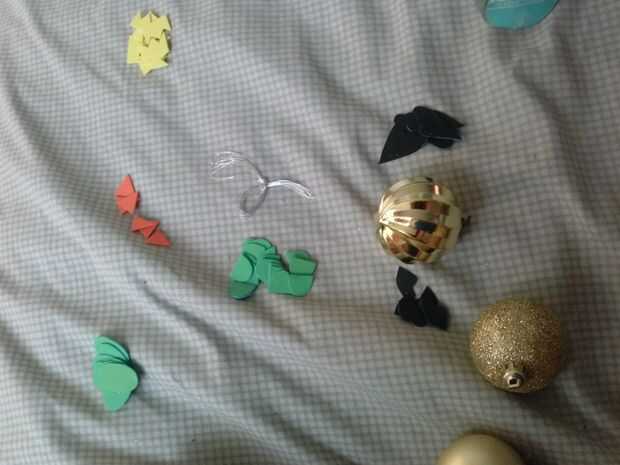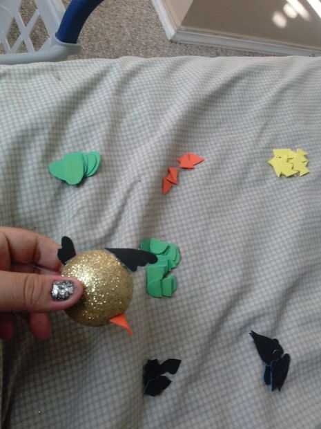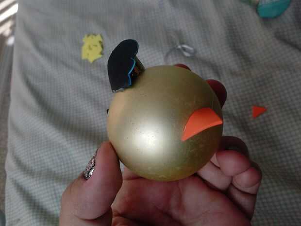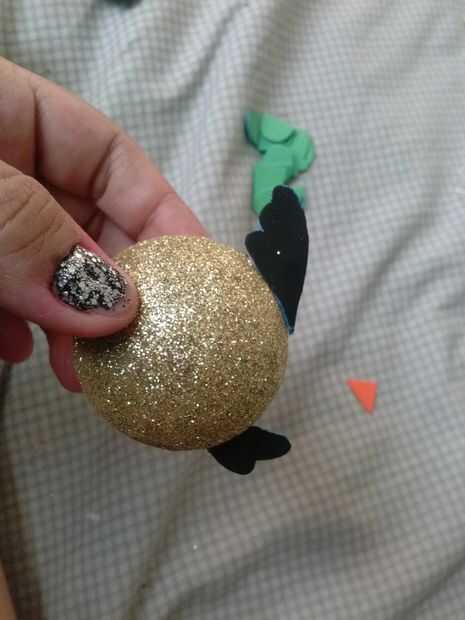 Pegar las plumas superior hacia el lado del lazo abierto. Dejando todo abierto para el gancho. Luego pegue las plumas espaldas en el medio de la ornamentación. Finalmente pegar el pico a la parte delantera.