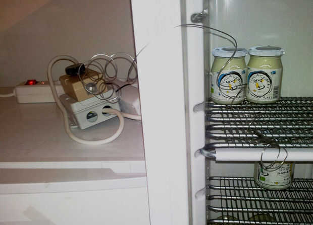 Construcción de un frigorífico, un congelador funciona, pero como el congelador tiene un fuerte sistema de enfriamiento, agua del aire condensa fácilmente. Por lo que es húmedo dentro, pongo una toalla en el piso de frezzer. El dispositivo está conectado entre el enchufe y el congelador.