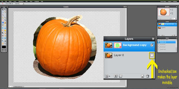 Desmarcar la casilla en la capa 0 ahora ha hecho lo que podemos ver el fondo alrededor de la imagen de la calabaza que tenemos que quitar.