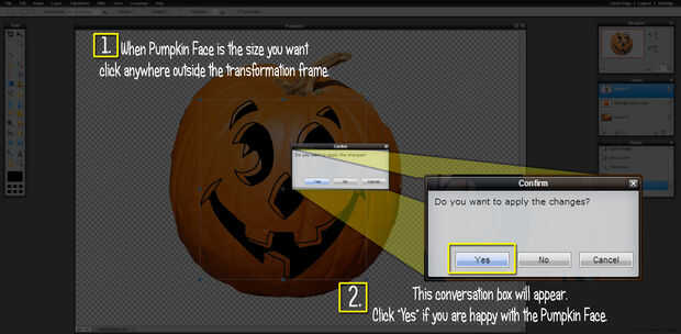 Cuando termine la cara de la calabaza de tamaño, haga clic en cualquier lugar fuera del marco de la carpa.