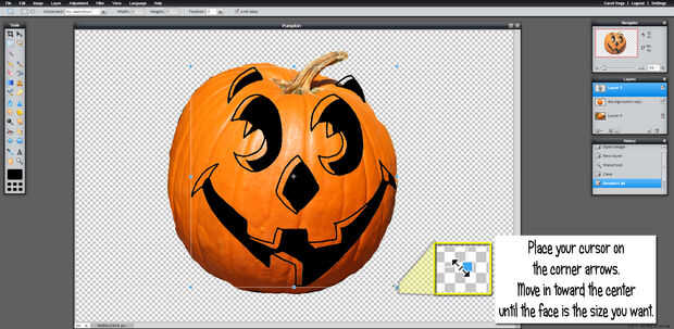 Transformación libre , aparecerá un cuadro alrededor de la cara de la calabaza. La caja tendrá "mangos" en cada una de las esquinas y en el centro de cada lado. Puede utilizar estos puntos para hacer la imagen más amplia, mayor - utilizando las