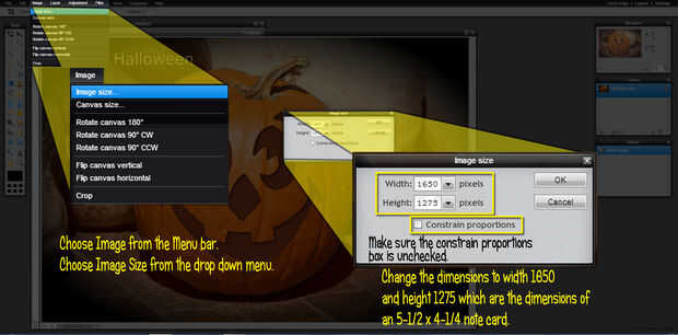 En el cuadro de opciones de tamaño de la imagen, cambiar el tamaño a 1650 de anchura y altura 1275.
