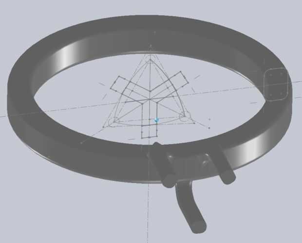 El ajuste se trasladó a la superficie de este anillo, que se celebraría la parte posterior de la piedra contra el frente del anillo. Los filetes en las garras fueron cuidadosamente diseñados para llegar a separación máxima donde estaría el borde de la piedra mientras se mezcla cuidadosamente en la superficie. Debido a la asimetría leve de la piedra, estos filetes no eran perfiles circular continuados, pero no demasiado difíciles de hacer coincidir.
