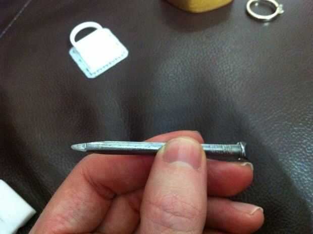 Mark, quien asiste con un montón de proyectos, de tierra un clavo grande para tener un extremo de la cuña en su mayoría redondeadas estrecho bastante para caber entre las garras de la oposición. La punta fue sólo un ángulo suficiente para formar una ligera muesca en el punto donde debe quedar la piedra.