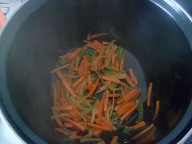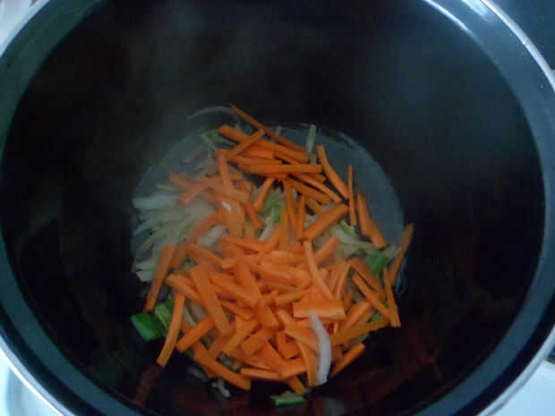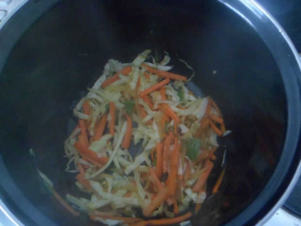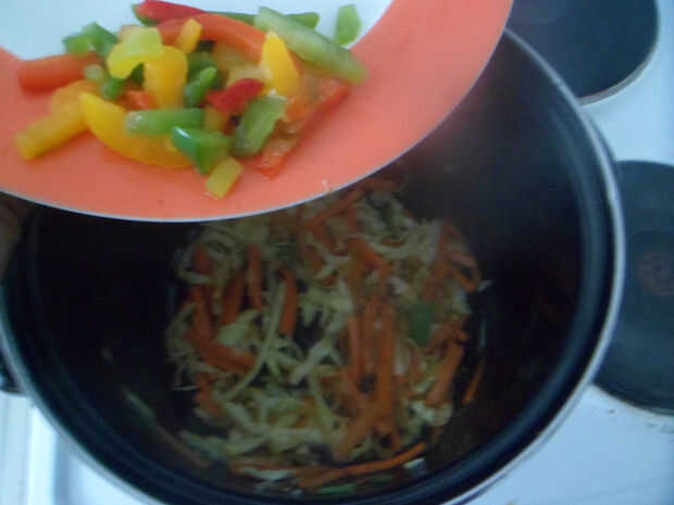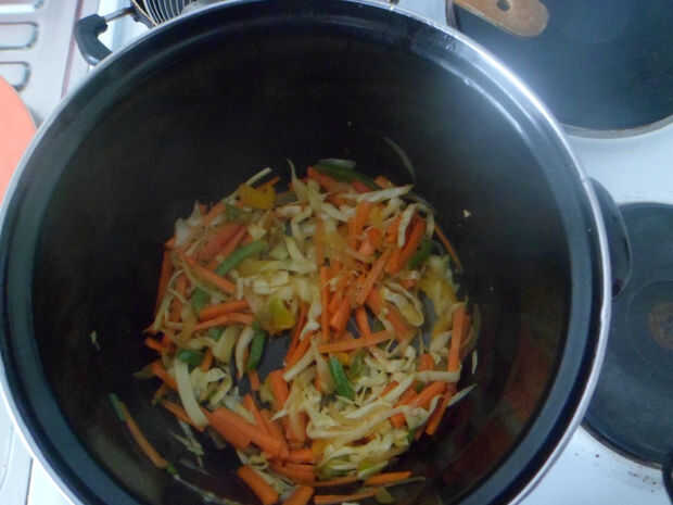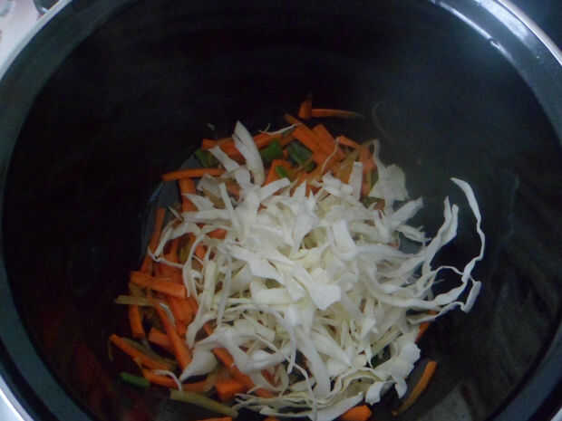 -El siguiente paso es añadir las zanahorias en finas rodajas y repollo.