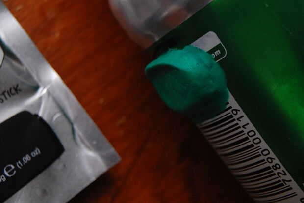 3. divide la sugru en dos trozos grandes y ponga un trozo pequeño a un lado de la manija de la tapa.