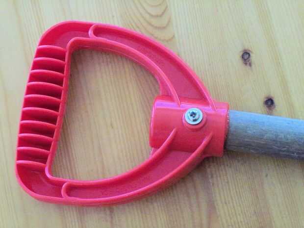 nunca inclinarse otra vez a pala de nieve!  Agregar un segundo mango de cualquier herramienta descompuesta con un mango en D (o incluso una pala de cheapy corte), dos piezas de madera y unas tornillos y tuercas.  Funciona incluso mejor que las palas