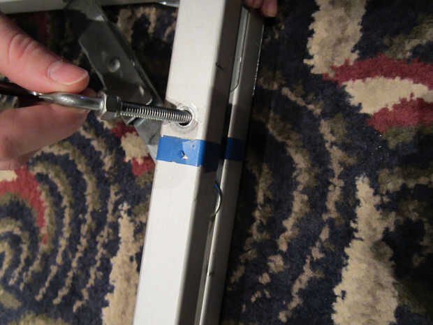 Coloque las piernas con manivelas a través de los agujeros en las patas de la pantalla y el marco.