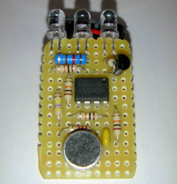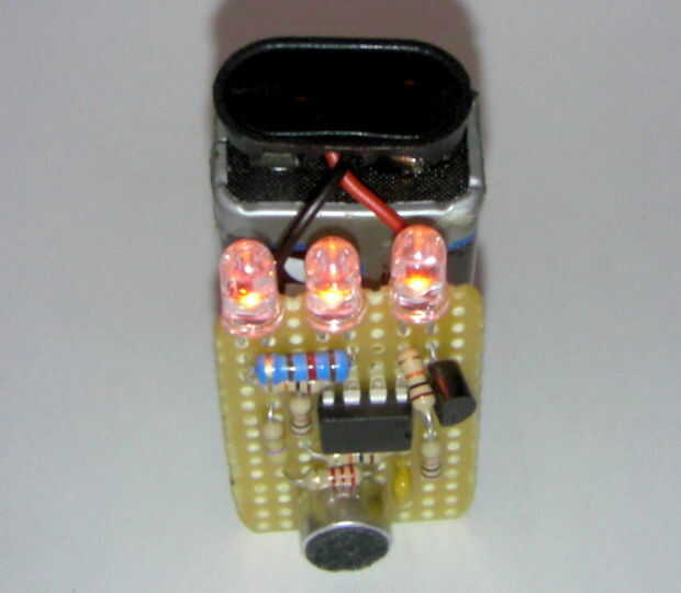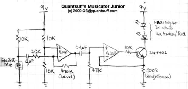 Los 'cerebros' de este proyecto es un LM358 uso general op-amp que cuesta bajo 30 centavos. La primera mitad del circuito es un amplificador que aumenta los 500 micro voltios de un micrófono electret para acerca de 1 voltio. Este nivel generalmente se llama nivel de línea y puede utilizarse para conducir nuestros LEDs, un amplificador de audio o se incluso los pines de entrada de un procesador de Arduino.