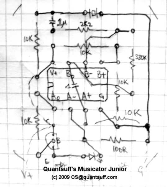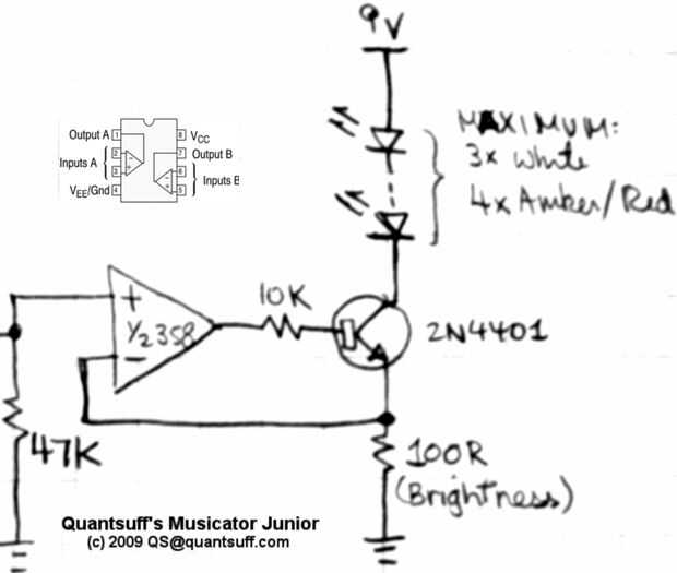 La segunda mitad del amplificador operacional se utiliza como un convertidor de voltaje a corriente, que limita el brillo de los LEDs a 10 mA o menos.