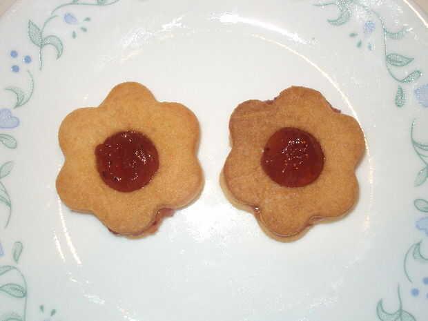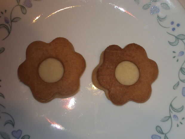 6. con la galleta superior (el uno con el agujero) se reúnen al atasco en el agujero y presione hacia abajo y deje que se enfríe la mermelada actuará como pegamento