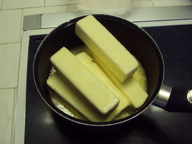 1. derretir la mantequilla pero no lo consigo demasiado caliente, que si es así, debe dejarlo enfriar antes de agregarlo para que no mata la levadura. Sólo mantenerlo el tiempo suficiente para conseguirlo derretido.