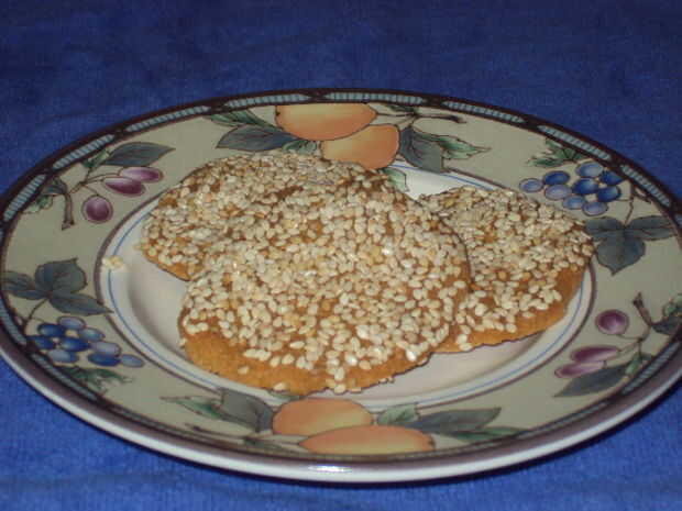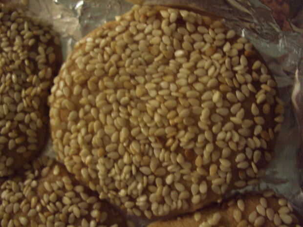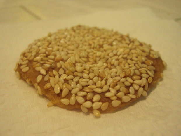 4.) cocer al horno a 350 grados o hasta que la galleta sí mismo esté dorado oscuro y las semillas de sésamo son de color marrón dorado y fragante.