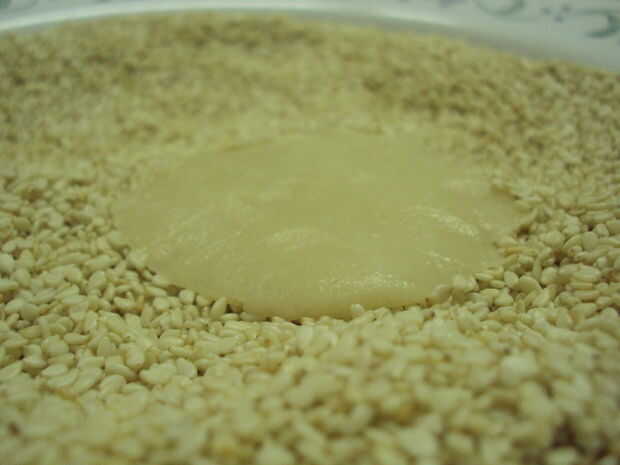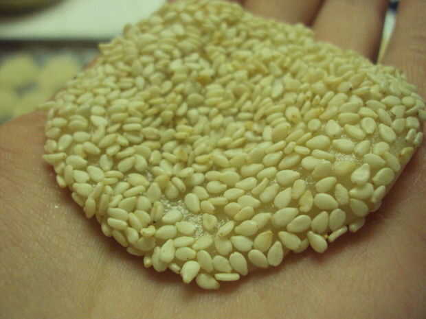 3.) tomar el aplanado hacia fuera pieza de y dip una lateral en la semilla de sésamo hasta que estén bien cubiertas.
