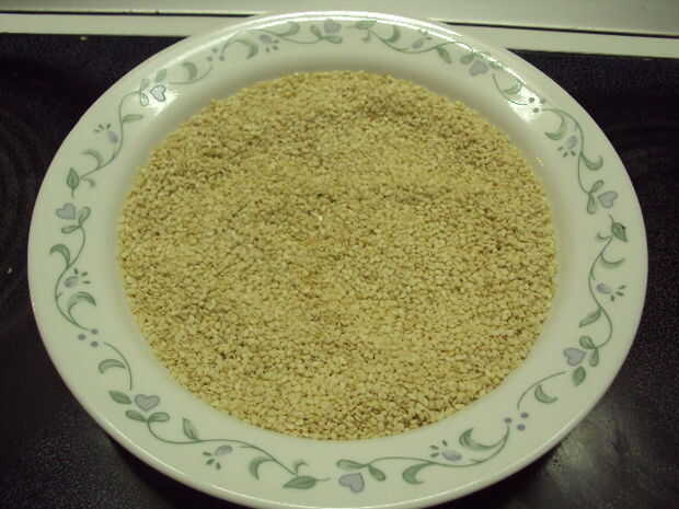 1.) en una sartén amplia, colocar 1 taza de semillas de sésamo sobre fuego medio alto. Lanzando de vez en cuando, tueste las semillas hasta que son oro ligero en color. Les no tostar demasiado porque el horno terminará de hacerlo para usted.