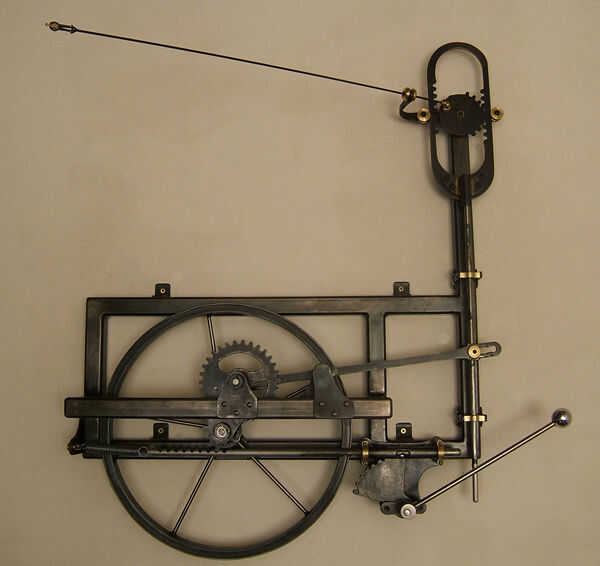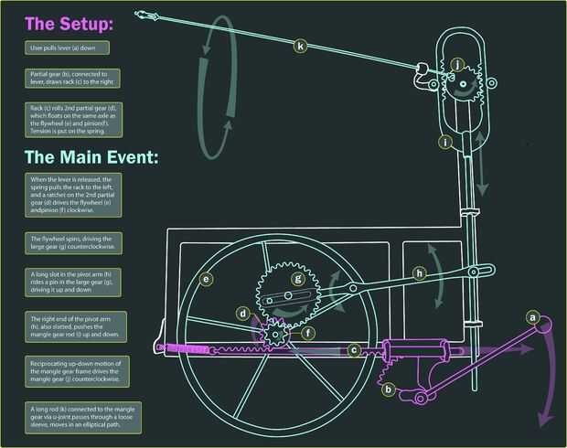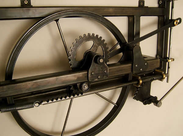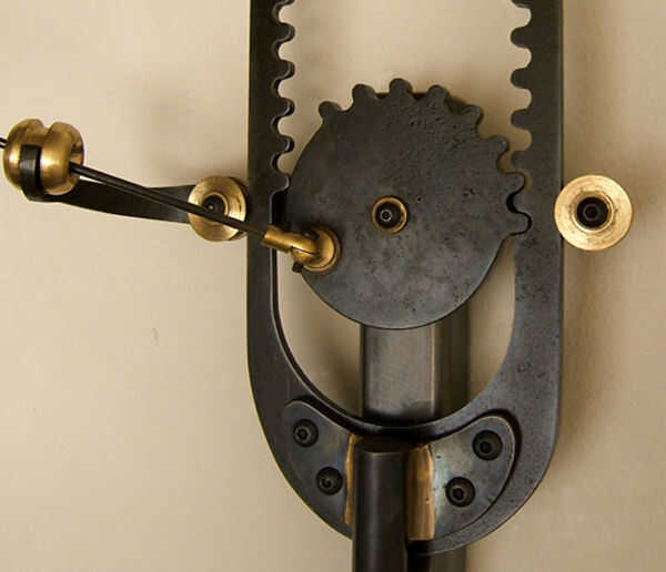 una de las cosas que me hace sentir bien sobre el mundo que me rodea es la gravedad. Es una fuerza muy de débil, y sin embargo cada cuerpo de la materia en el espacio ejerce fuerza gravitacional sobre todos los otros cuerpos en el espacio. Eso significa que tú y yo. Nos estamos tirando, unos a los otros, en los planetas, estrellas, rocas, árboles, nubes gaseosas. Todo. Así que quería hacer algo, de una manera vaga, de gravedad. Fuerza de entrada es almacenada en un resorte, entonces transferido a un volante, luego a un engranaje, entonces una palanca y finalmente un mangle-engranaje de conducción una varilla en un ángulo extraño. En que barra se encuentra una figura, anclada a la máquina.