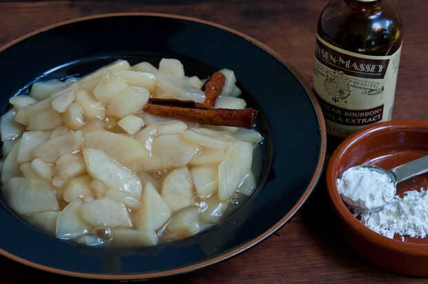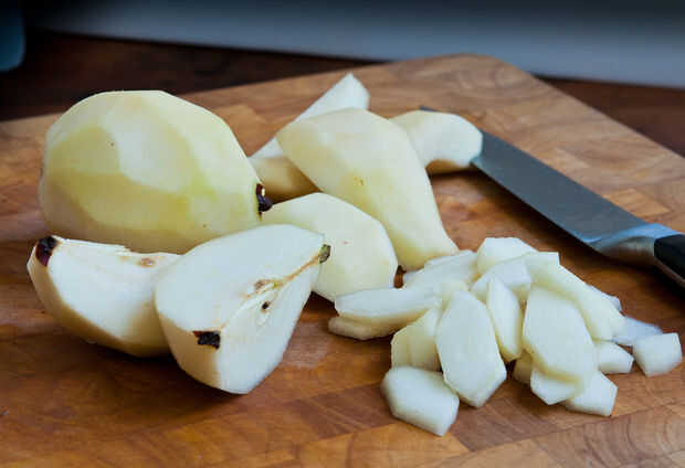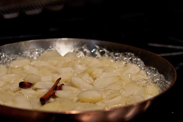 Poner a hervir. Baje el fuego y cocine a fuego lento hasta que las peras estén tiernas y el almíbar comienza a espesar.