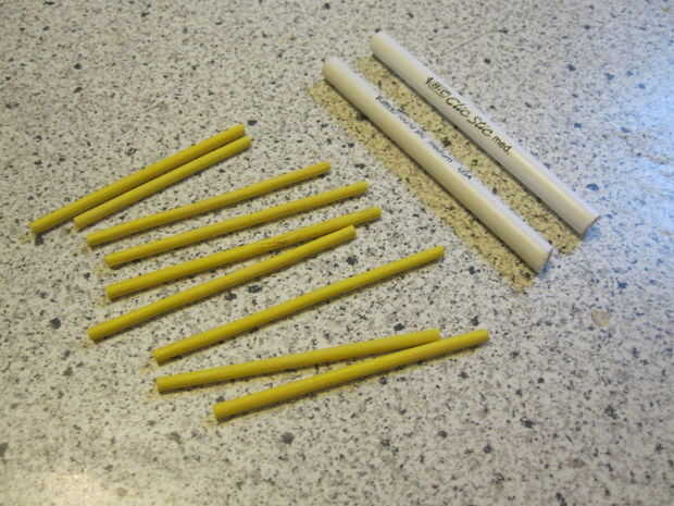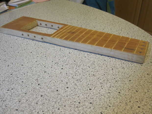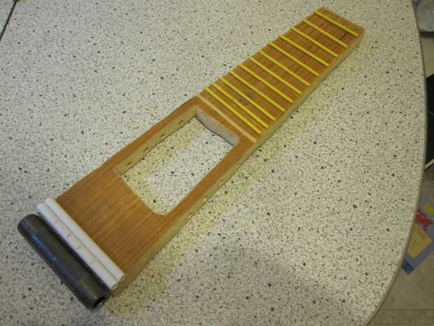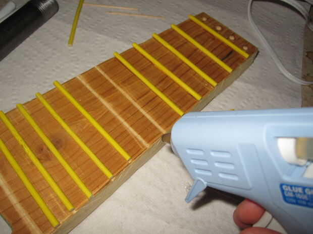 Ahora puede cortar tus trastes de palillos de dientes grandes o traste de alambre y corte dos en 4 piezas de los corrales. Entonces puede pegamento caliente los trastes, tubo de acero y piezas de pluma para el ukelele.