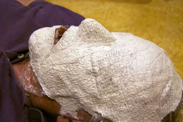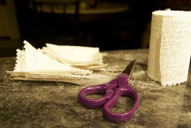 Sumergir cada trozo de yeso en agua tibia y coloque sobre la cara, traslapando ligeramente hasta cubre la cara.