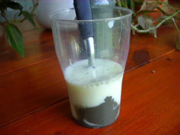 Esto es tan simple, no requiere explicación. Agregue el cemento a la leche, una parte de cemento 4 partes leche. Ejemplo: para 1 litro de leche, 250 cc de cemento. Esta proporción varía según las preferencias de cada persona. No seas tacaño, sin embargo.