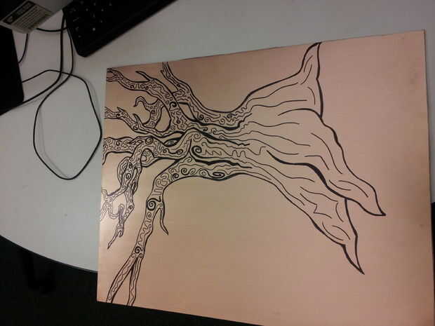 Hay muchos sitios, especialmente de Instructables, que te dará muchas formas de preparar su PCB. Pero, sólo para recapitular el proceso que hice, aquí va. En primer lugar, tomar la placa de cobre y fregar limpia y suave con un estropajo. Luego, una vez limpio y seco, tome la Junta Directiva y dibujar, marcador permanente, el diseño que quieras, en mi caso el árbol. Una vez que el diseño que quieras, con una buena cantidad de tinta aplicada, deberá esperar y, básicamente, 'bake' la tinta sobre el tablero. Una vez que la tinta se ha "cocido" puede toma el cloruro férrico y usa para quemar lejos el cobre no cubierto por la tinta. Tienes dos opciones para el cloruro férrico. Uno, podría sumergir el PCB si es lo suficientemente pequeño o tienes un recipiente lo suficientemente grande. Dos, usted podría limpiar lejos el cobre a mano con el cloruro férrico. Ni modo es conveniente, pero la limpieza por el método de la mano es agotador. Me tuvo suerte y pudo sumergir mi 16 x 20" PCB en un recipiente grande utilizado por la Facultad y estudiantes de grabado y simplemente olvidarse de ella.