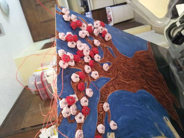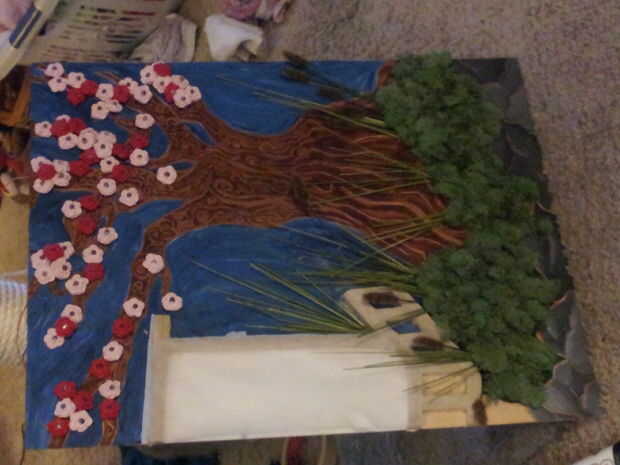 El siguiente paso lógico sería pintar. Lo que hizo, fue pinté todo lo posible para buscar relativamente realista (color sabio) y he intentado muy duro no cubren el cobre que se queda después de la quema. Si tienes una fecha límite, sugiero que trabajar este paso lo antes posible ya que tiene que hacer para seguir adelante. También decidí incluir un poco de la casa de té que la mayoría de la segunda pieza de mi plan maestro había continué con él. Para crearlo, tomé unos largos de los tacos cuadrados de madera y cortar a su tamaño y tipo de gratis los formó en una versión bastante agradable (una vez terminada). Estos fueron conectados con el adhesivo caliente ya que tiene un agarre justo y rápido y fácil de usar. También, para las flores, lo que hice fue ordené un molde de flor fuera de eBay y luego presiona algunos arcilla Sculpey III en él. Luego convertía todo y cocido al horno hasta que se curaron.