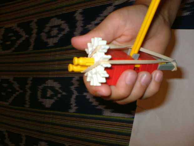 una pistola pequeña de KVG que dispara tubos de pluma y cuenta con gran variedad y exactitud.Paso 1: partes piezas necesarias:2 palos amarillos10 arandelas azuluna banda de caucho2 clips de caras doble naranjaPaso 2: construcción tomar los 2 amarillo
