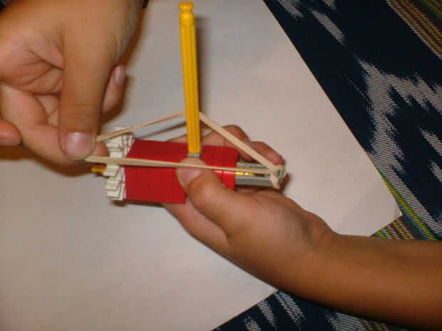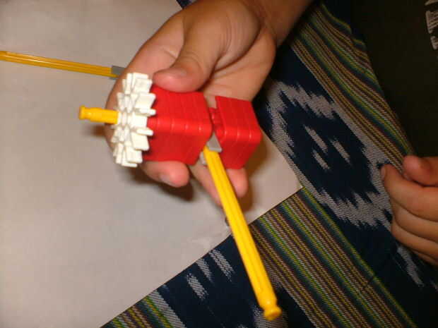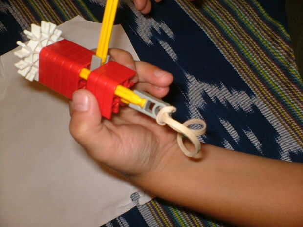 Poner el resto de los conectores rojo en la barra amarilla para mantener el 'gatillo' en su lugar. Los cuadros más pequeños muestran cómo colocar el perno de la leña y la banda de goma.