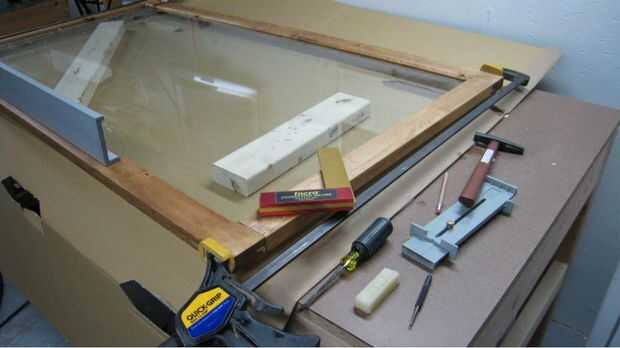 Asegúrese de lijar la madera antes de armar el marco. Pongo un bisel en el lado del vidrio para facilitar la escritura. También teñido y acabado de la madera antes del ensamblaje