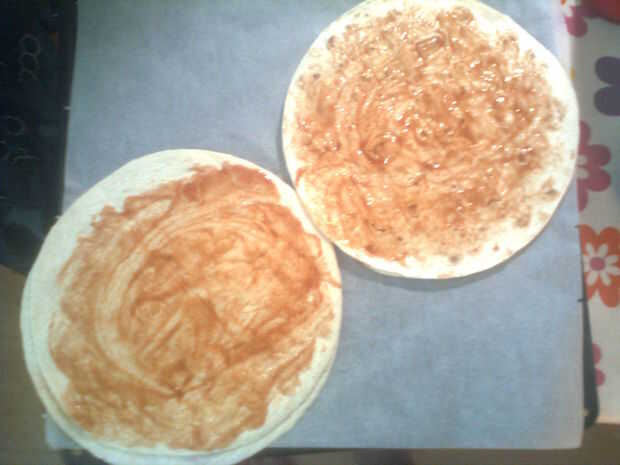 Entonces cubrir el tortillabase con una fina capa de salsa, uniformemente.