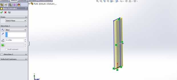 seleccionar características (en la parte superior izquierda) y haga clic en "Extrusión Base jefe." Entonces saca el bosquejo a. 125" y guardar.