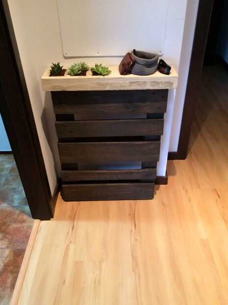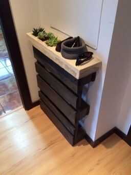 ya que es fácil conseguir de paletas, quiero convertirlos en muebles. Tenía la idea de combinar una mesa con una librería propia y tan había planeado esto.Usé: una plataforma estándar, unas tiras de persiana veneciana, cuatro pequeñas escuadras metál