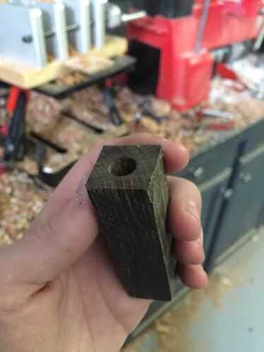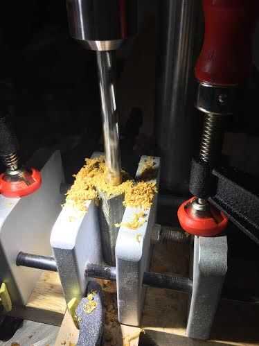 Una vez que se corta, tenemos que perforar el centro del tubo de latón de sujeción. Antes de perforar, use una regla y un lápiz para encontrar el punto central en el extremo de la pieza bruta. Yo uso un vicio de la pluma-turners, pero usted puede conseguir creativo un hacen trabajar sin uno. Ahora, perfore a través de ese punto central. Asegúrese de ir lento! También es una buena idea para perforar un poco más y entonces retraerá la broca para que el polvo puede escapar, utilizando el método de "en-n-out" (no un término técnico). Si su vicio y en blanco no están sujeta firmemente hacia abajo, tienes que hacerlo.