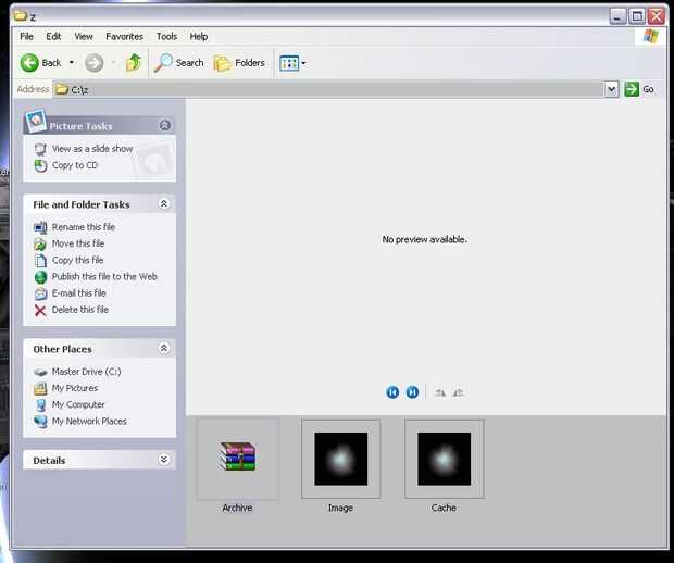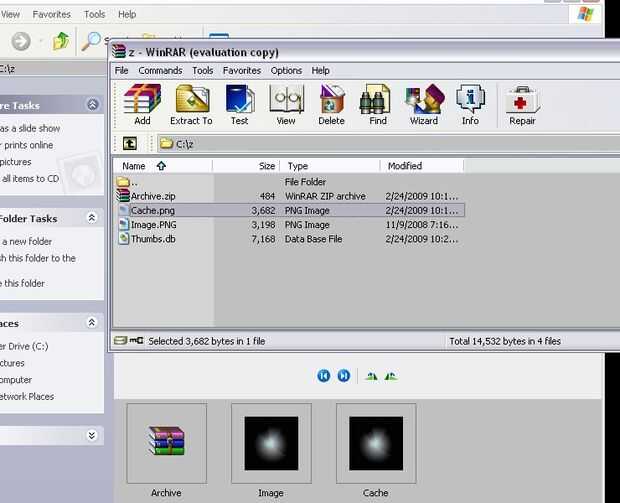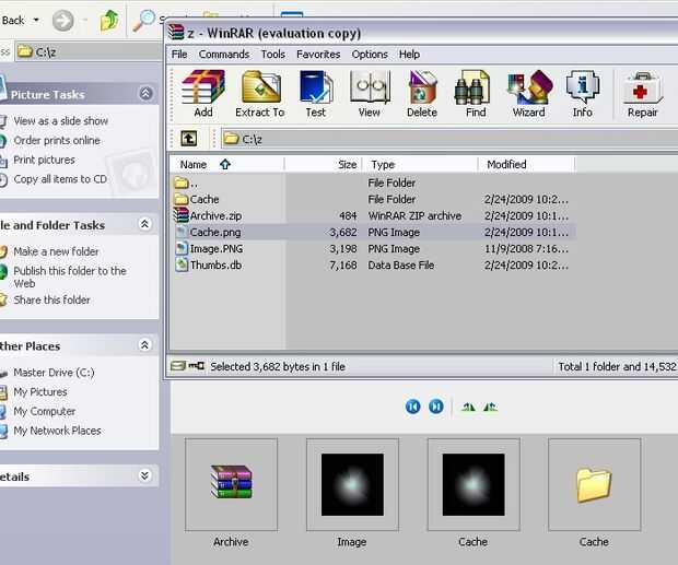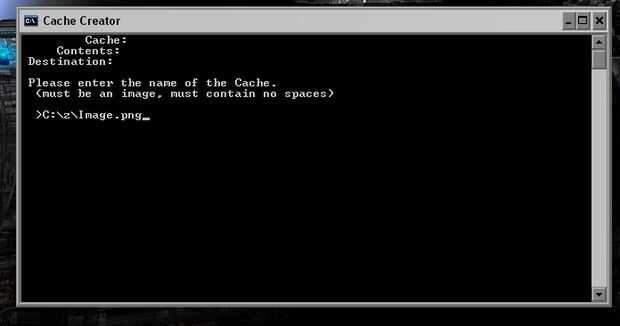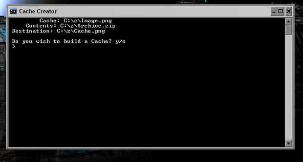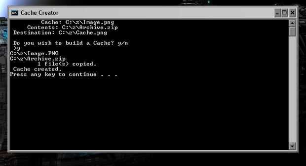 Ahora sigue las instrucciones de Leprecaun: comprimir los archivos que desea ocultar en un archivo como "Archive.7z" (7z Portable es un archiver muy buena; WinRar es demasiado, pero usted tiene que comprar). El archivo-a-ser-oculto debe ser un archivo si alguna vez desea recuperar su contenido! En segundo lugar, elegir una imagen que la memoria caché; Me gusta usar PNG e imágenes de mapa de bits, que se puede hacer fácilmente usando la pintura. Coloque su imagen y su archivo en un directorio sin espacios (C:\z) y ejecutar creador de caché. Escriba la ruta de archivo de la caché (C:\z\Image.png) y presiona ENTER. Ahora escriba en su contenido (C:\z\Archive.7z). Usted no puede entrar en el archivo antes de la imagen; Si lo hace, la imagen no se mostrará cuando se abre el archivo y alguien podría borrar tu Cache, pensando que es un error. Por último, entrar en destino de la caché, el lugar se creará y asegúrese de incluir la misma extensión que la imagen que utilizó. Usar la misma carpeta como mi archivo (en este caso C:\z\Cache.png). Tipo "y", oprimir la tecla ENTER, y tiene un caché! Para recuperar su contenido, abrir 7z Portable/WinRar/lo que sea, seleccione su caché y golpear "Extraer". Si usted había protegido con contraseña tu archivo (muy bueno) usted tendrá que introducir la contraseña. Los archivos resultantes deben ser exactamente igual que los enterrados en la memoria caché.