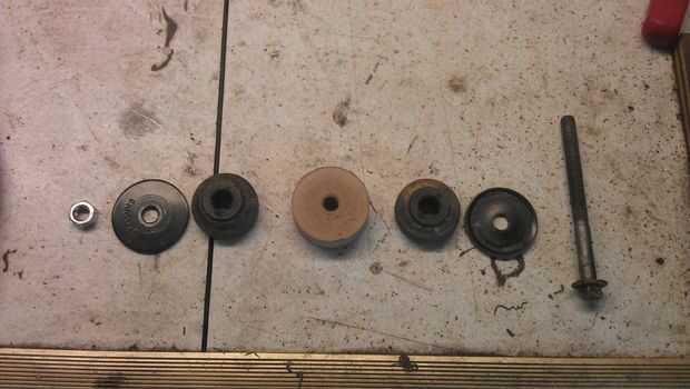 2 Hazte un perno, unos bujes de goma y dos arandelas planas grandes, también necesitas una tuerca que funciona con el perno. Es una buena idea usar pernos más largos y de esta manera se puede montar fácilmente en la prensa del taladro.