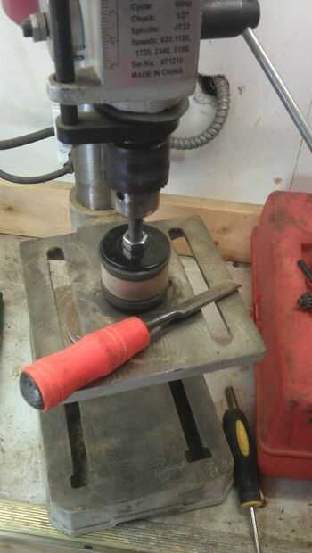 4 poner el conjunto en el taladro y levantar la mesa para que la cabeza del perno está en el pequeño orificio de la mesa, esto para evitar que se balanceo hacia los lados y con la tabla de esta alta encima de él es más fácil descansar las manos en él mientras sostiene la herramienta de corte.