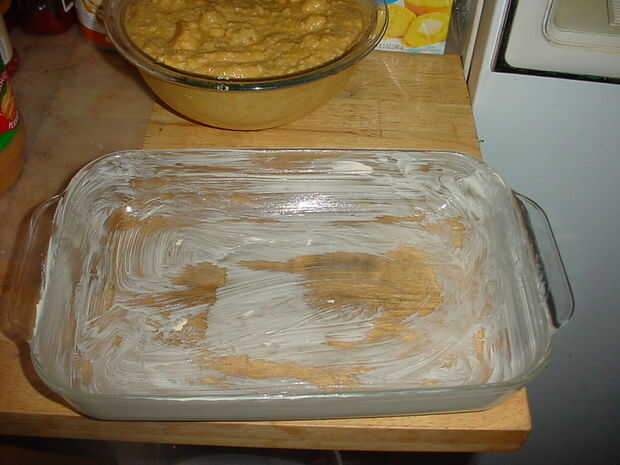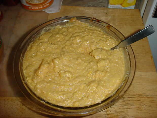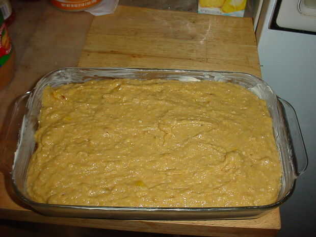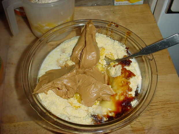 descarga de las cajas de mezcla en el recipiente, añadir los huevos, 1/2 taza? leche, miel y manteca de cacahuete y mezclar con un tenedor, poner los duraznos y la mezcla de cereales y revolver más. Permite sentarse para 10-15minutes wiile precalentar el horno a 325f y engrase una cazuela pequeña. Vierta la mezcla en el recipiente engrasado y al horno por aproximadamente una hora o hasta que un cuchillo salga limpio. Puse un plato pequeño de agua en el horno así, no estoy seguro si hace algo pero no duele...
